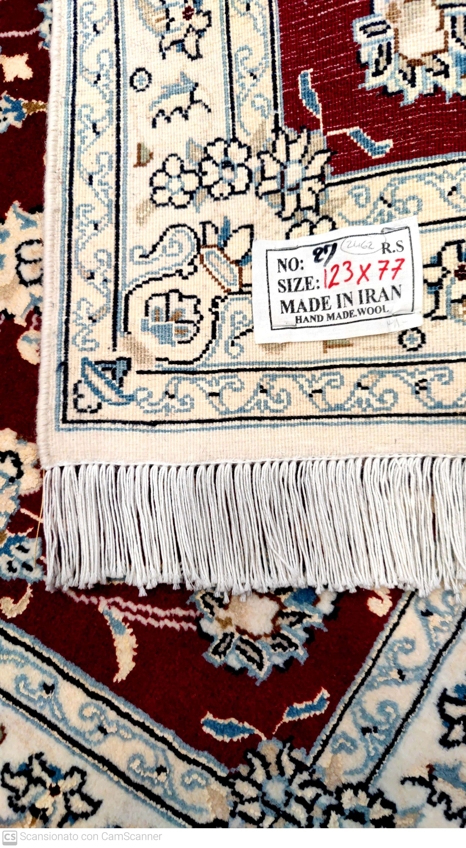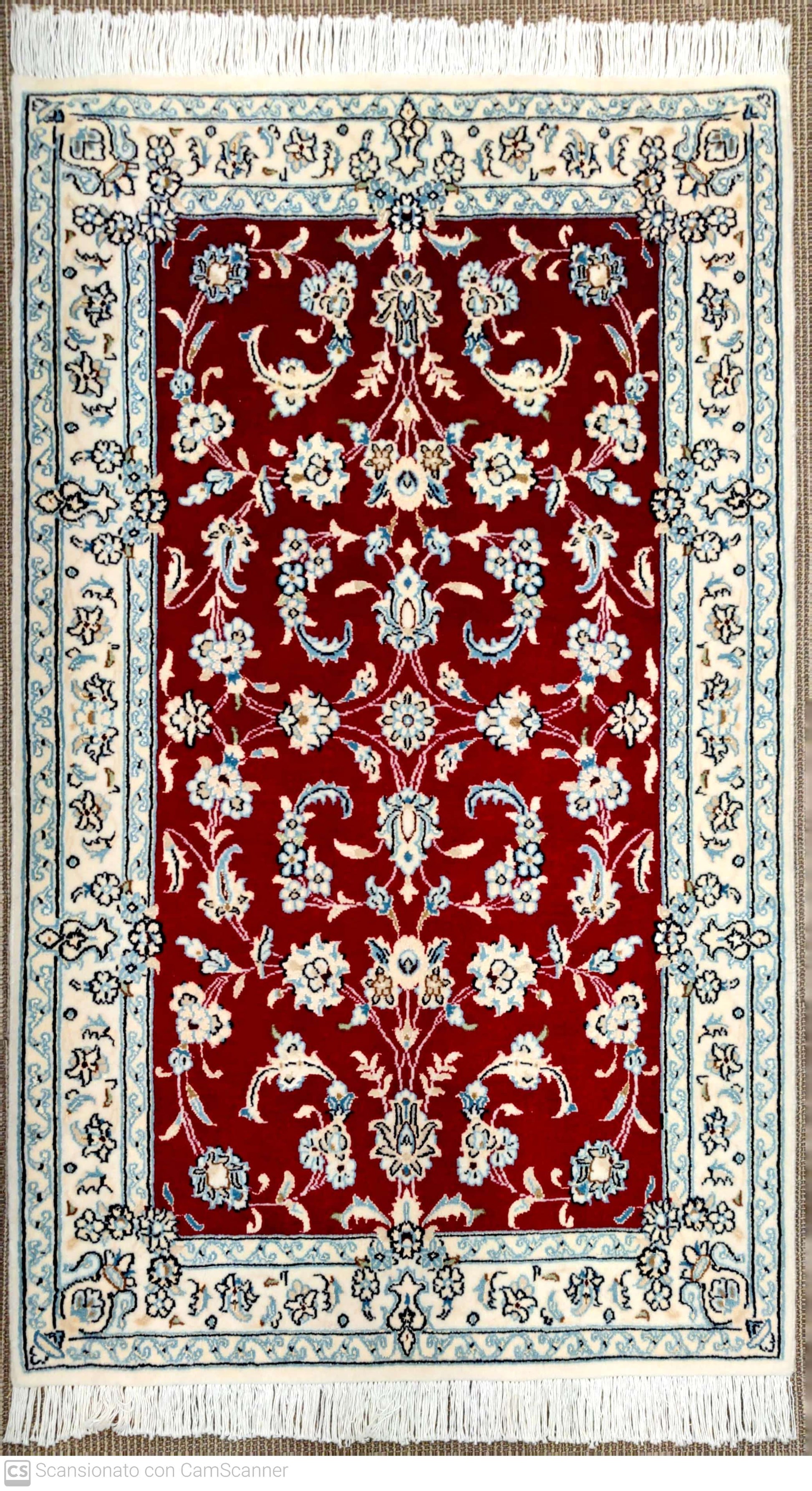 Uno splendido set gemello di tappeti persiani Nain , caratterizzato da intricati dettagli in seta mista e un bellissimo rosso con bordo bianco . I tappeti misurano 121 x 78 cm e hanno un aspetto lussuoso . L' intricato dettaglio dei tappeti è davvero mozzafiato , e la combinazione del morbido bordo rosso e bianco li rende un'aggiunta spettacolare a qualsiasi stanza . I dettagli in seta aggiungono una bella lucentezza ai tappeti e la combinazione di colori crea un look unico e sofisticato . I tappeti sono perfetti per un arredamento tradizionale o contemporaneo , aggiungendo un tocco opulento che renderà lussuosa qualsiasi stanza . I tappeti sono annodati a mano , cosa che li rende molto resistenti e assicura che durino negli anni a venire . La squisita fattura artigianale di questi tappeti li rende davvero unici nel loro genere . Questi tappeti gemelli sono una bella aggiunta a qualsiasi casa e saranno sicuramente ammirati e apprezzati per gli anni a venire .