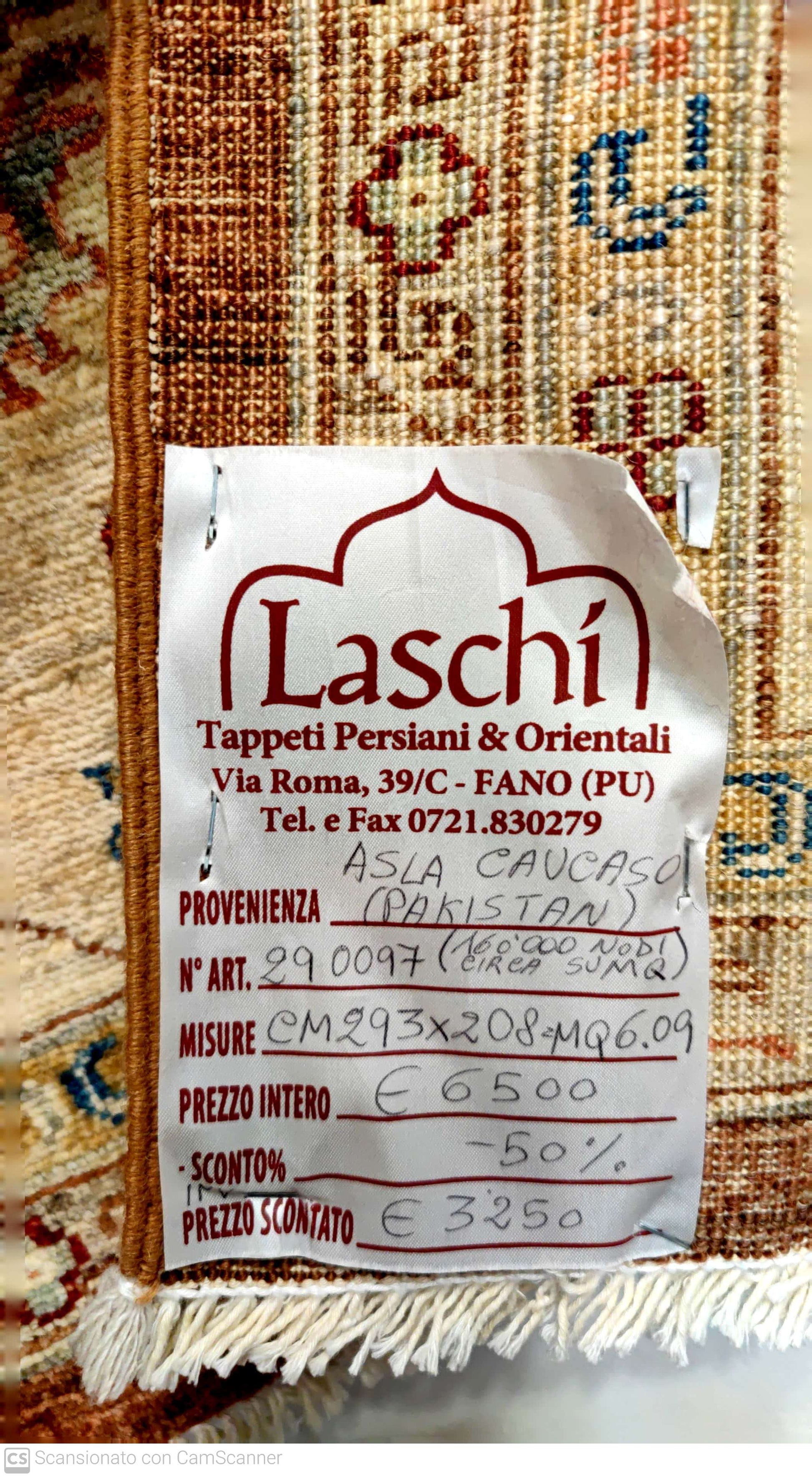 This exquisite rug has been hand-knotted in Pakistan, using only the finest quality wool, creating an extraordinary piece of artistry. The design features a stunning gold border with brown base, which adds depth and texture to the overall look. The floral pattern encompasses traditional motifs from both Central Asia and Persia, making it truly one-of-a-kind. This particular rug measures 293cm by 208cm (11' 6" x 8' 2"), large enough to fit most living spaces easily. It also has a low pile height of just 1/4", making it ideal for high traffic areas or even as an area rug over hardwood floors without worrying about snagging or damaging delicate fabrics beneath it. In addition to its durability, this rug is sure to provide many years of enjoyment due to its timeless beauty and intricate craftsmanship. As far as colors go, this carpet offers warm tones throughout; from beige shades in the background to deep reds in the flowers, adding warmth and coziness while still being incredibly chic at the same time! Furthermore, thanks to the use of vegetable dyes during production process all colors are guaranteed not fade over time - giving you peace of mind when decorating your home with this luxurious item! The Gold Border with Brown Base Floral Design Asla Caucaso Pakistan certainly makes an amazing statement piece for any room in your home - whether you're looking for something special for your foyer entryway or want something eye catching yet classic enough that won't ever go out fashion upstairs bedrooms –this absolutely fits bill!