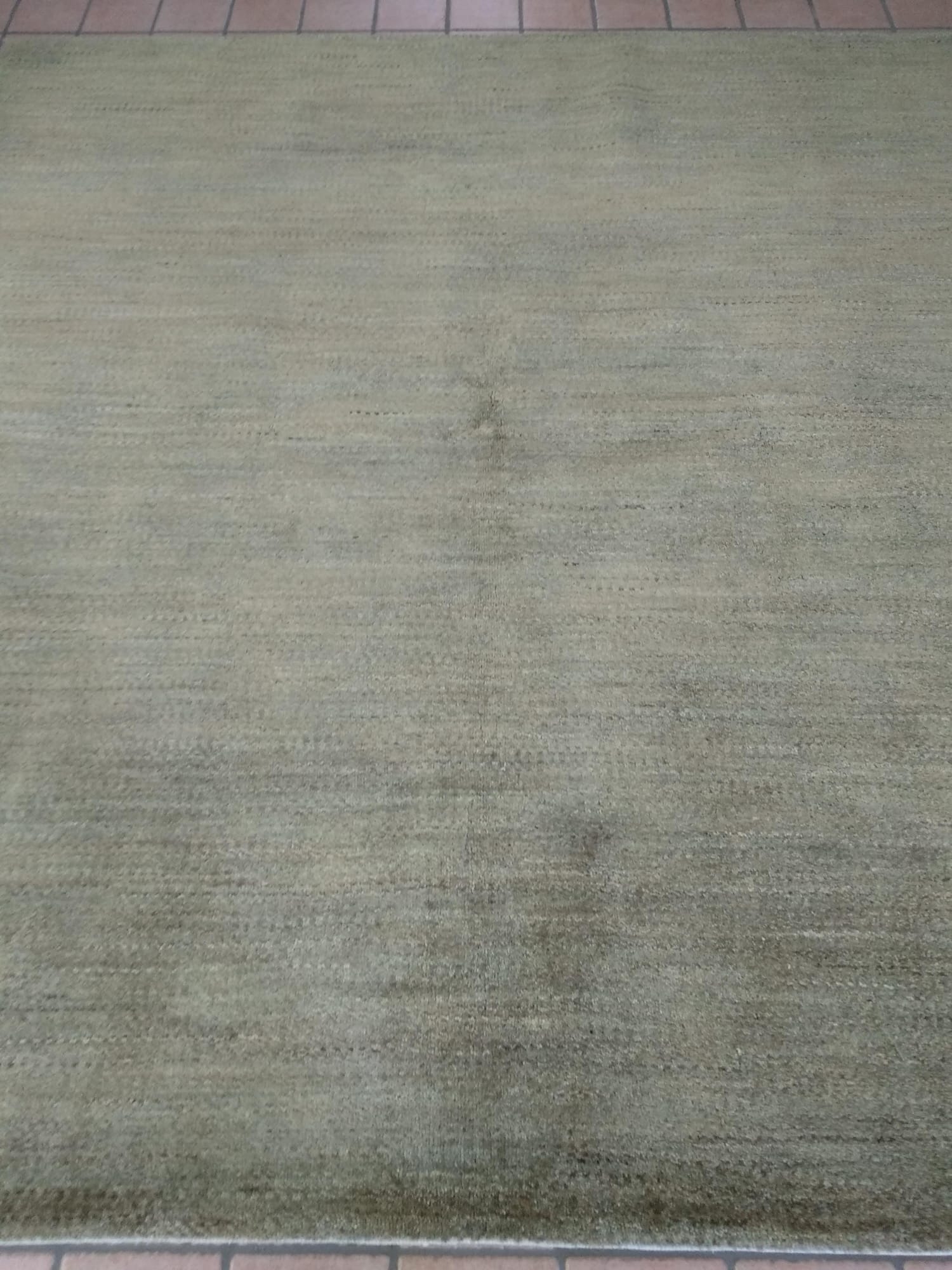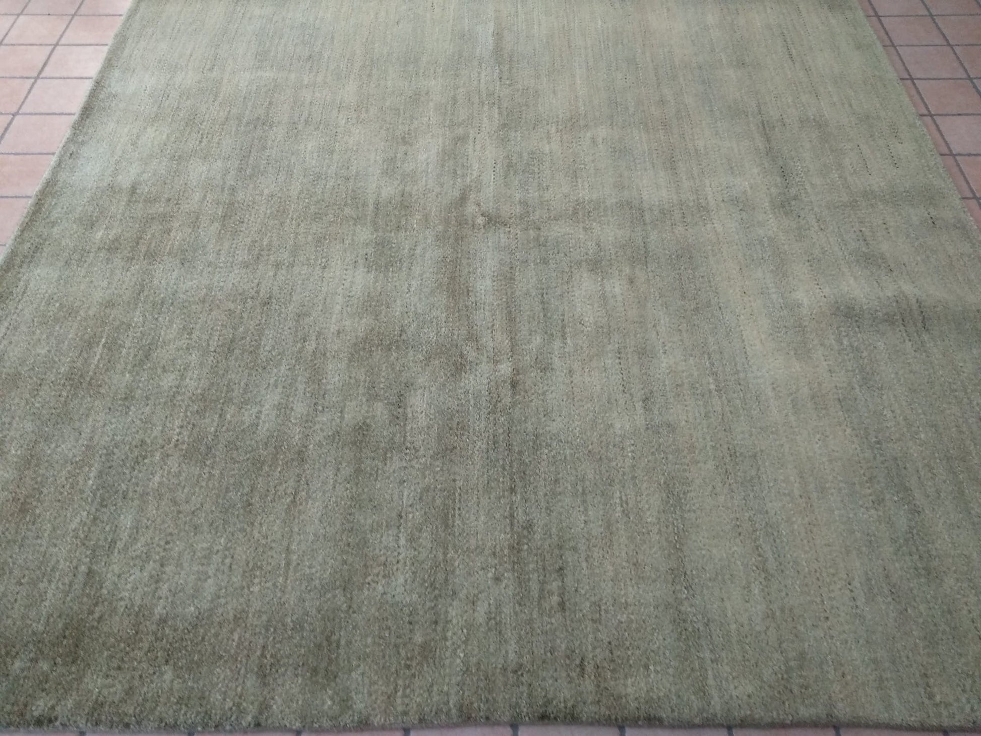 Gabbeh is a type of rug hand-made from wool with a cotton base and is very strong. It originates from traditional Persian rugs which were made by nomadic and rural weavers. The Gabbeh rug measures 207 cm by 199 cm and is green in colour. This particular Gabbeh rug was made in Pakistan, and is one of the finest examples of this type of rug. The Gabbeh rug has a unique design that is typically woven in a single, large piece. Its design is often geometric, featuring a variety of shapes, animals, and geometric patterns. This particular rug is one colour. The Gabbeh rug is constructed from wool fibers and a cotton base. This combination makes it very strong and durable, and able to withstand wear and tear over time. The wool used to create the rug is typically of high quality, making it soft and luxurious to the touch. The colors used in the design are carefully matched to create a beautiful and unified look. The process of making a Gabbeh rug is labor intensive and requires a great deal of skill and expertise. It is usually hand-made by experienced craftsmen who have been trained in the art of rug weaving. The process typically involves dyeing the wool, spinning it into yarn, and then weaving it into the desired design. The process is slow and precise, and can take days or even weeks to complete. This particular Gabbeh rug is an exquisite example of this type of rug. It is made with great care and attention to detail, and is sure to be a beautiful addition to any home. It is also a great investment, as it is sure to last for many years.