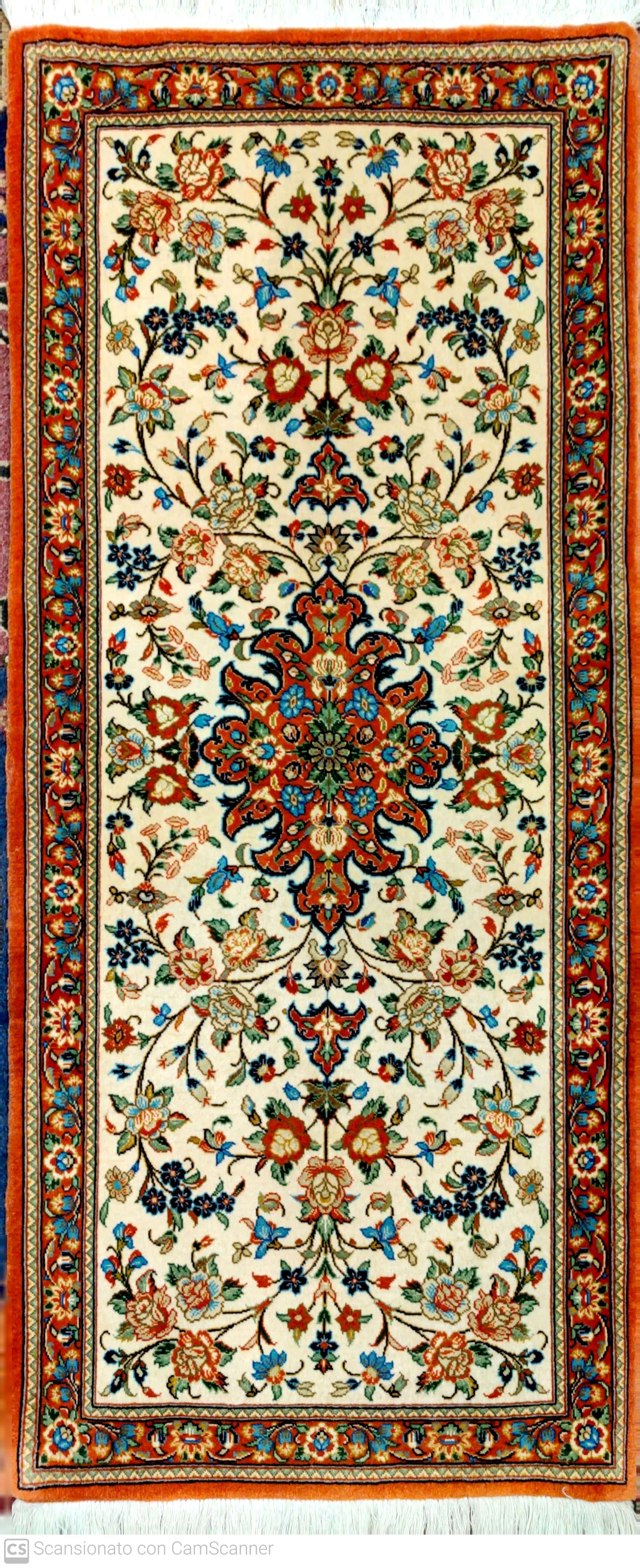 This beautiful Qum rug measures 134 x 69 cm and is hand-knotted in the city of Qum, in the province of the same name in Iran. Qum rugs are known for their high quality and exquisite designs, and this piece is no exception. The rug has a timeless and traditional design, with a central medallion surrounded by intricate floral motifs in shades of red, blue, green and cream. The intricate pattern is highlighted by the contrasting colours and the contrasting pile heights, giving the rug a three-dimensional effect. The rug is made of the finest wool, which is a soft and durable material that will last for many years. The pile is thick and luxurious to the touch, and the colours remain vibrant for years. This rug is an elegant and timeless addition to any home. It is sure to bring a luxurious and classic touch to any room. The stunning design, quality materials and expert craftsmanship make it a piece of art that will be admired for many years to come.