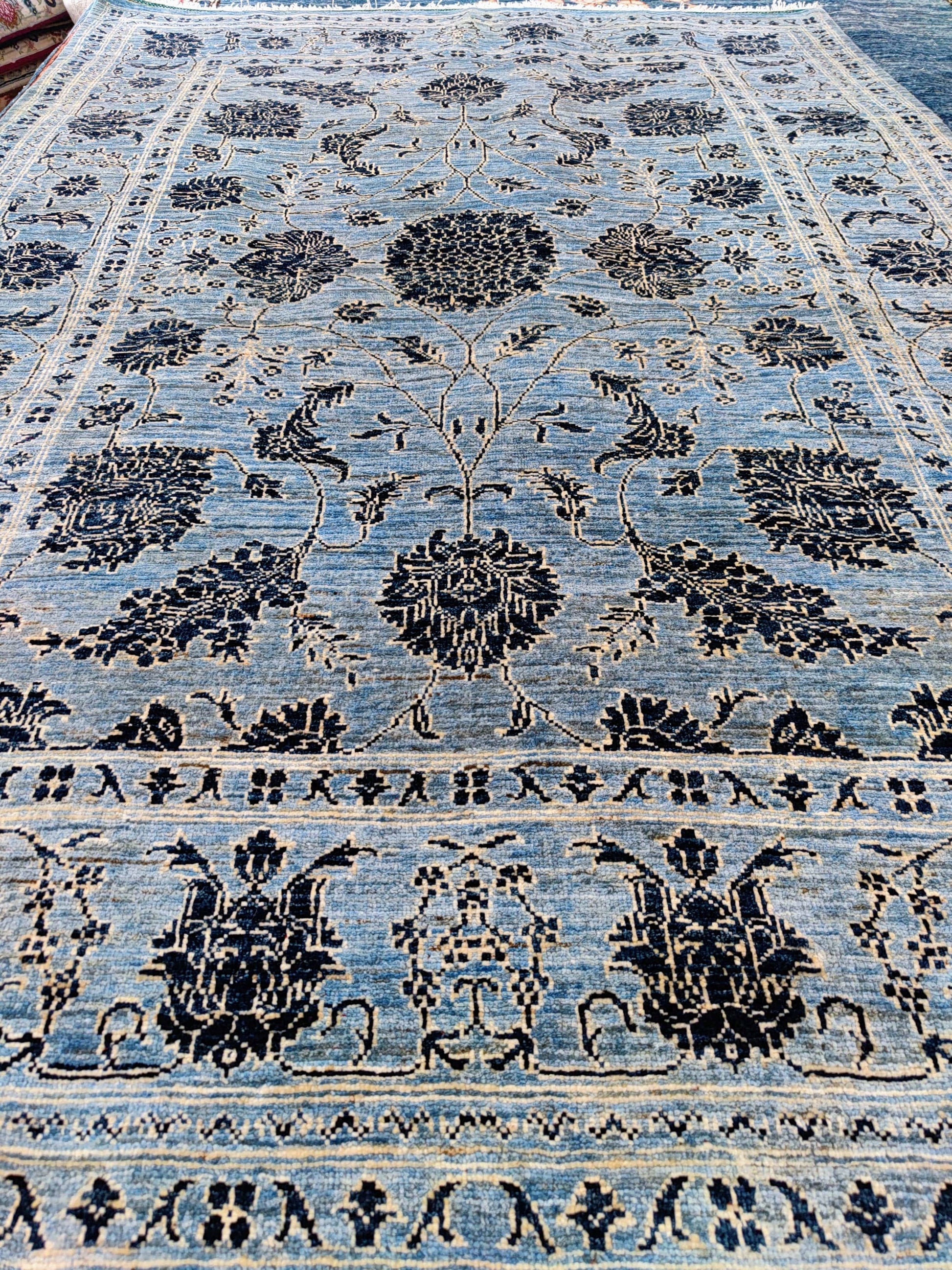 The dark blue design on a light cobalt blue base adds an elegant and royal touch to any space. The contrasting hues create a visually stunning masterpiece that effortlessly catches the eye. The dark blue design features an array of intricate patterns and motifs, showcasing the skilled craftsmanship that goes into creating each rug.